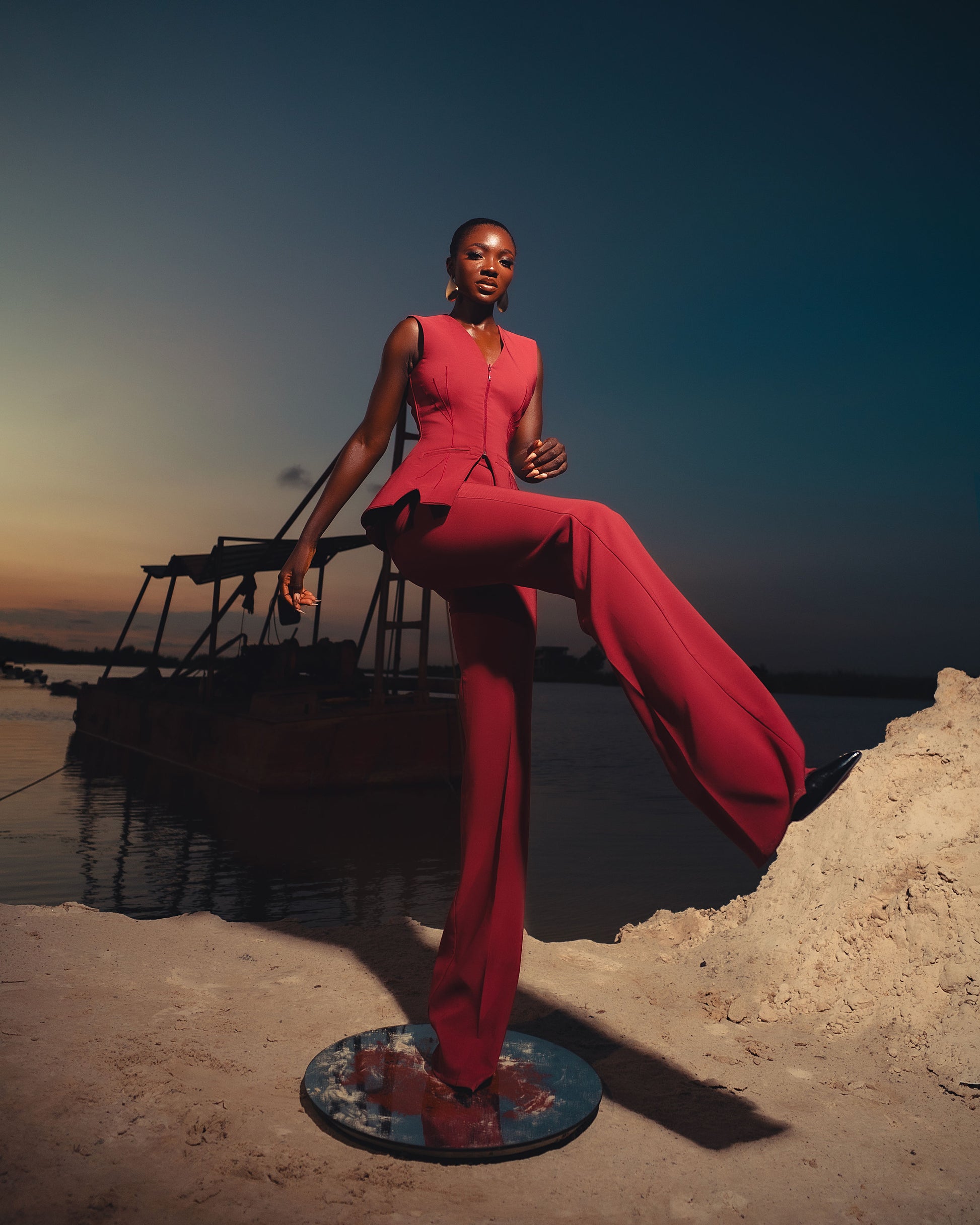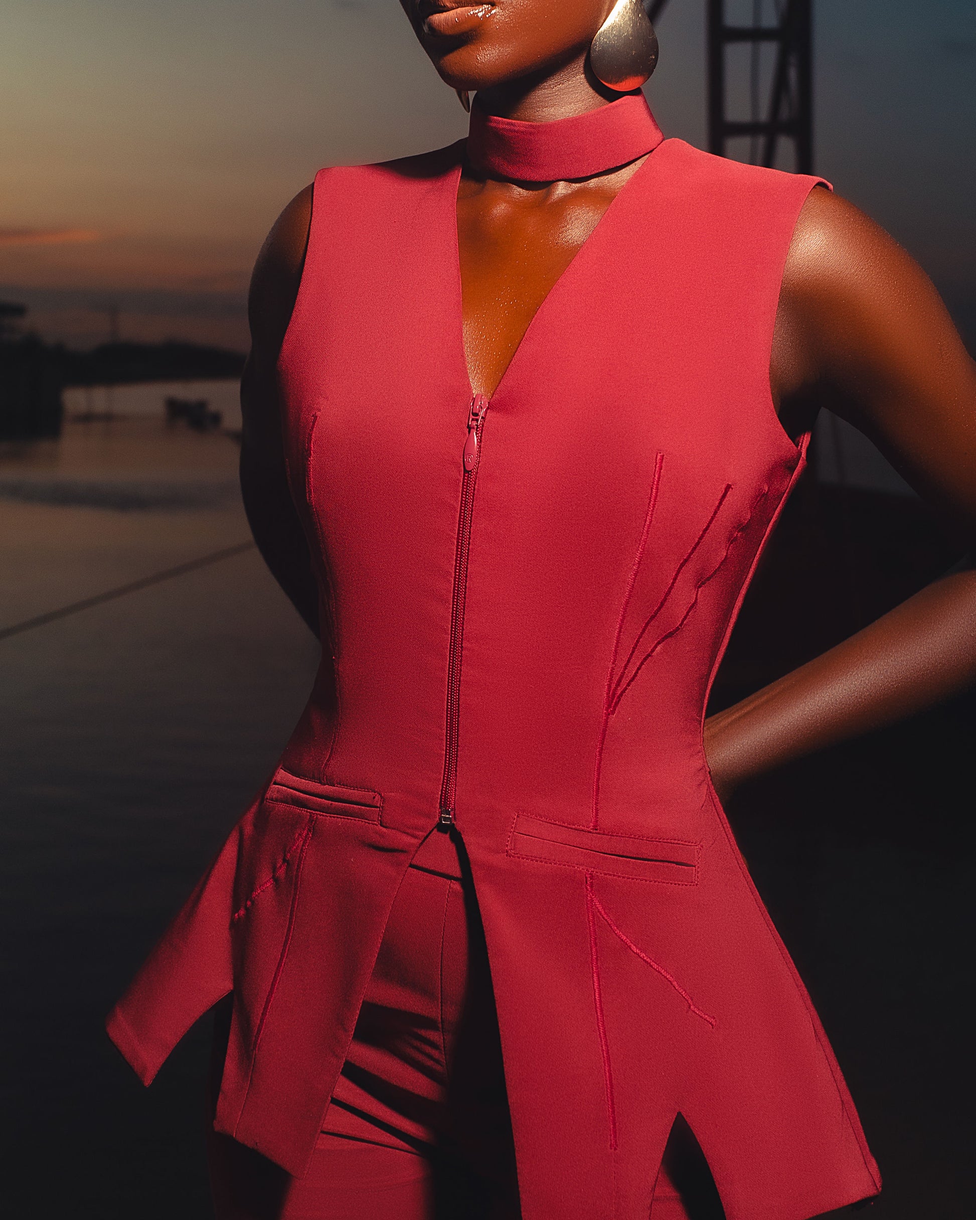 The ensemble, primarily in a bold, deep crimson tone, features a sleeveless, zip-front tailored top with architectural precision. What immediately stands out are the branch-like stitched embellishments that subtly trace across the bodice and hips, mimicking the natural reaching lines of tree limbs.